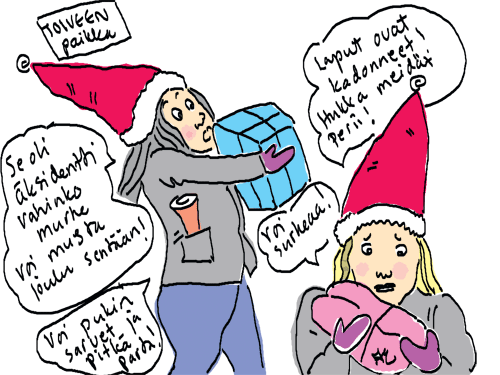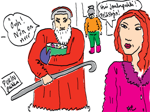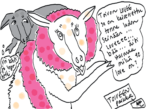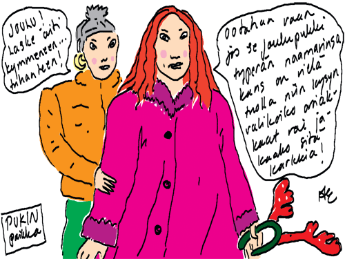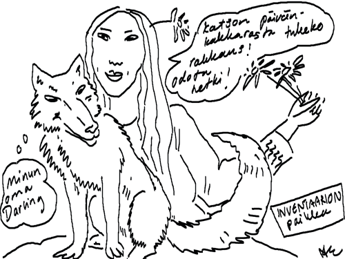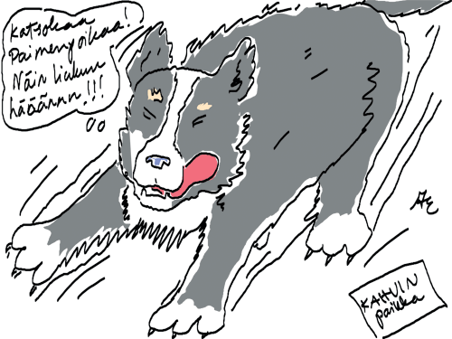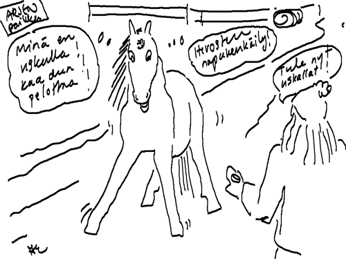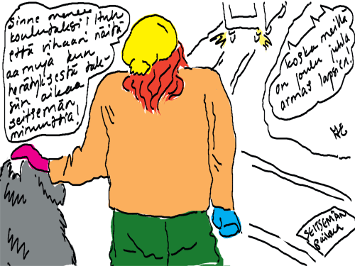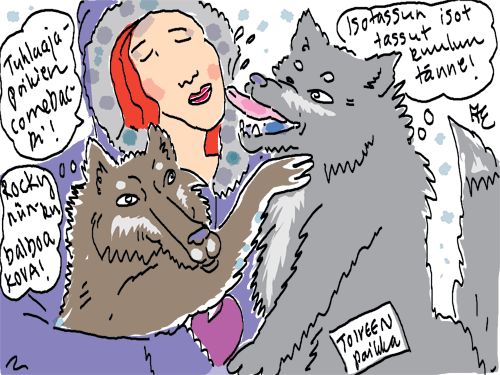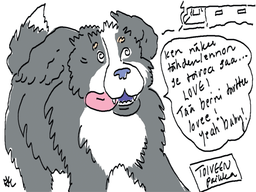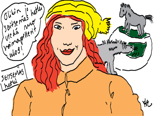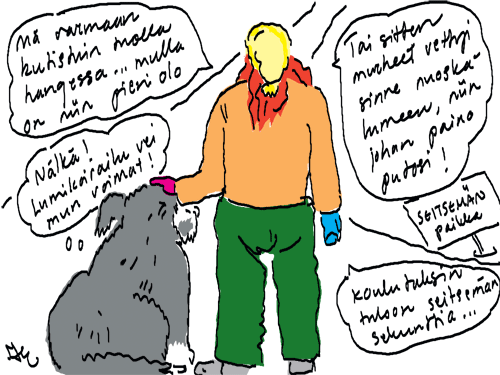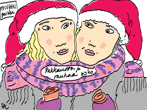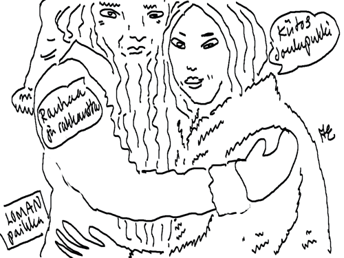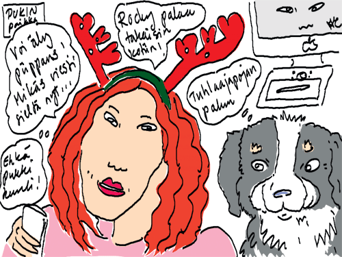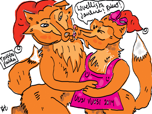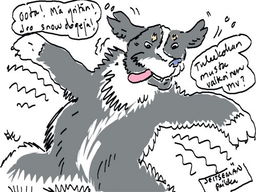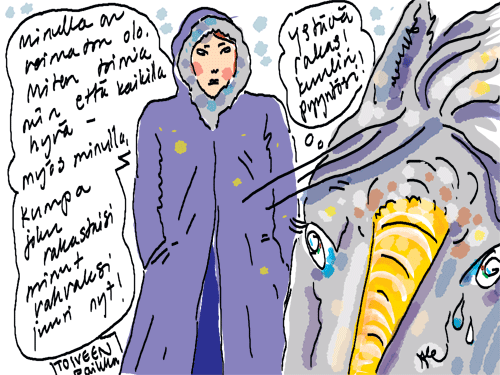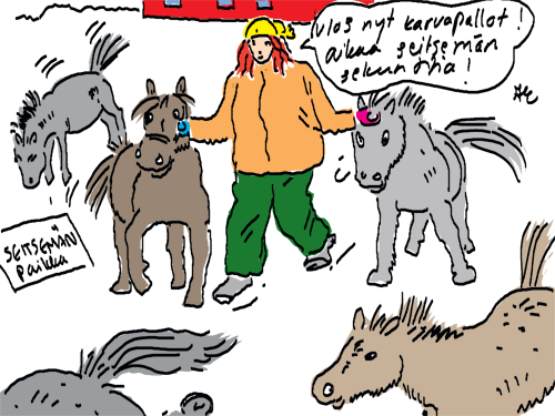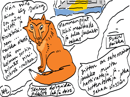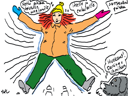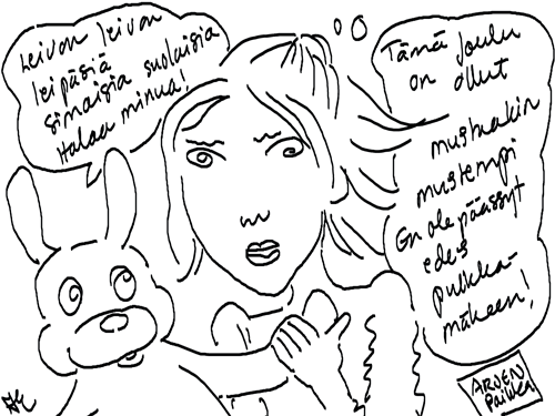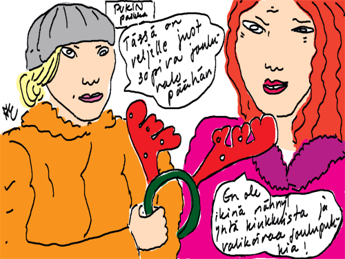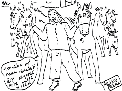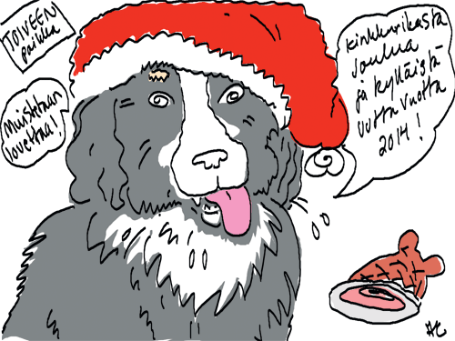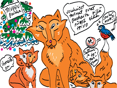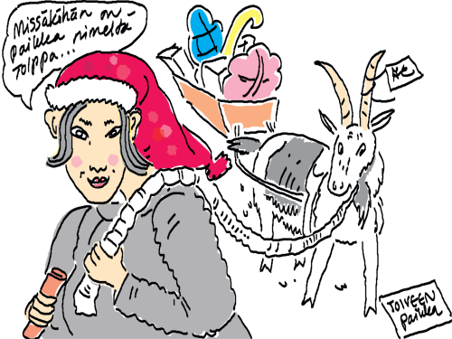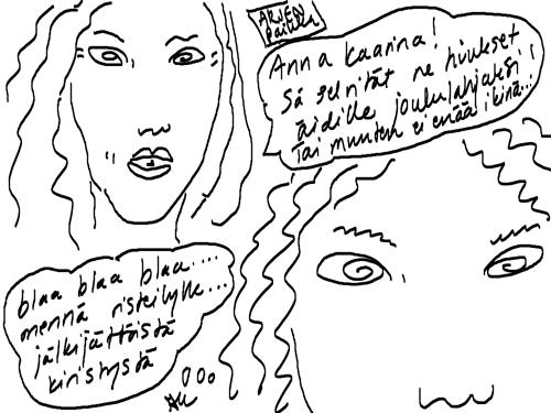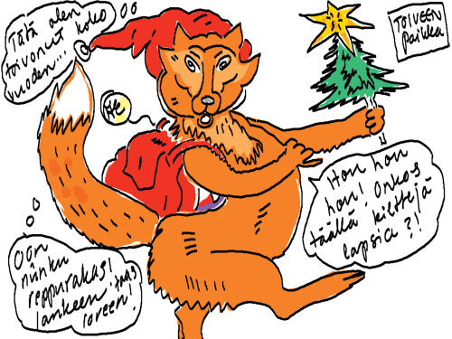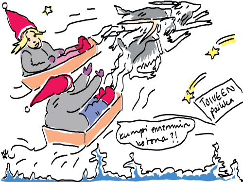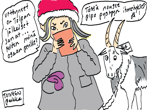 Voi ystävät! Pitkin päivää olen piirtänyt kuvan kerrallaan Joulun paikka tarinaa ja nauranut kertomuksen käänteille! Tähän väliin voin kertoa että ulkona sataa vettä ja meidän huvilan rinne on aivan paljas jäätikkö jonka päällä on vielä kaiken lisäksi vettä! Totesin hetki sitten Paimenpoika koirani kanssa että ulkohuussiinkin meneminen on pimeässä itsetuhoinen yritys. Tällä hetkellä istun tallin heinäladossa, pikku tauko, vielä Pitäis kiskoa kolme ahkiollista puruja talliin. Yhteen ahkioon menee kolme kottikärryllistä ja yhdeksään karsinaan jokaiseen yksi ahkiollinen. Tuuli ulisee nurkissa. Pakko jatkaa hommia että pääsen värittämään joulutarinaa...