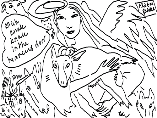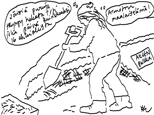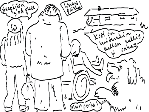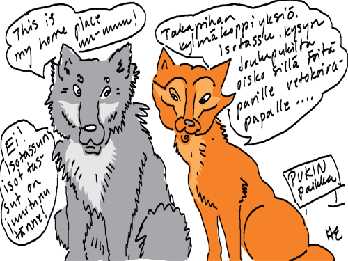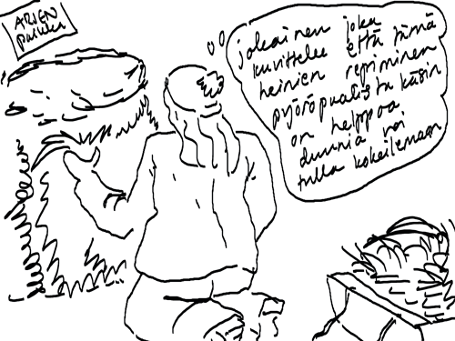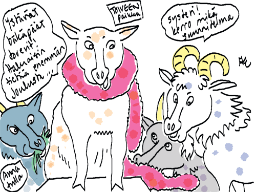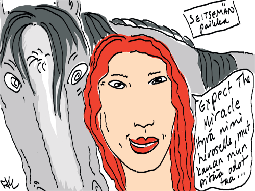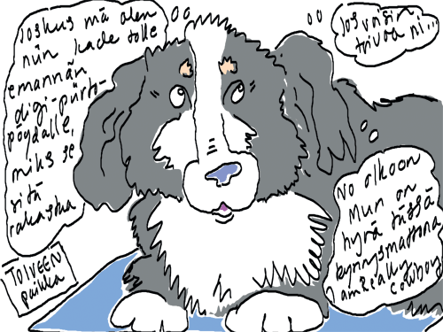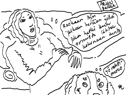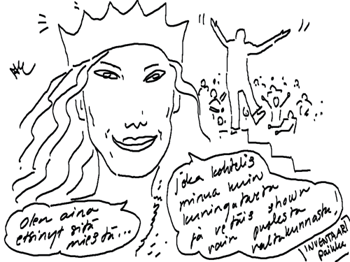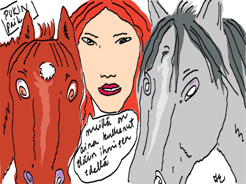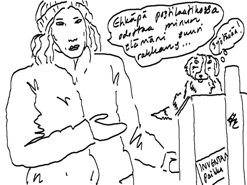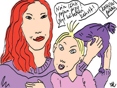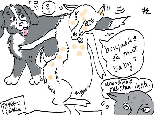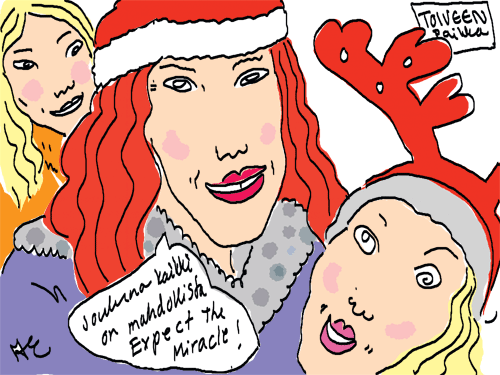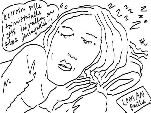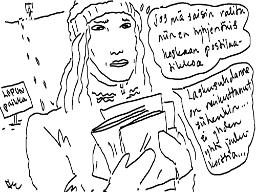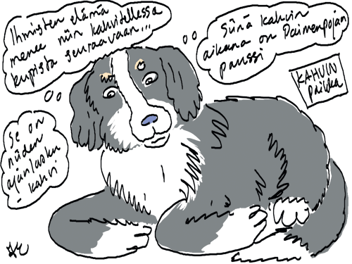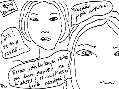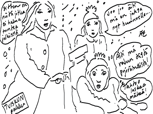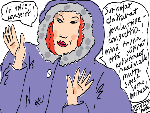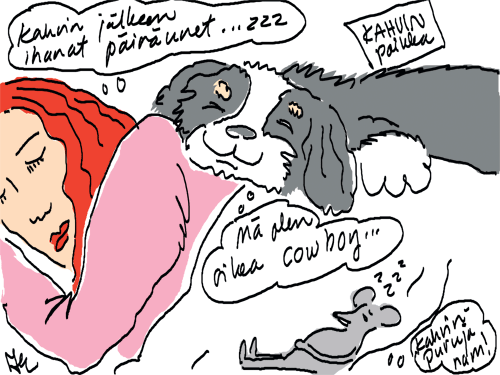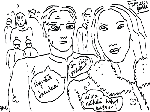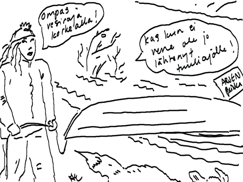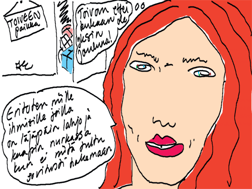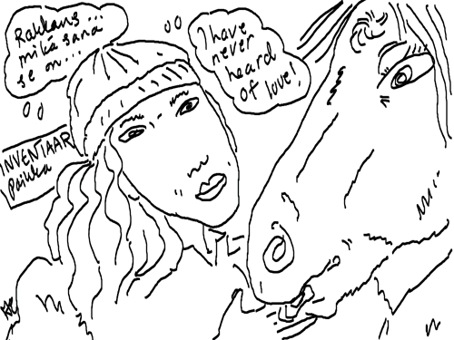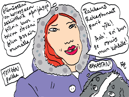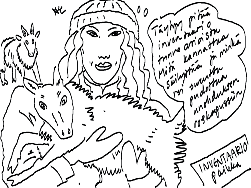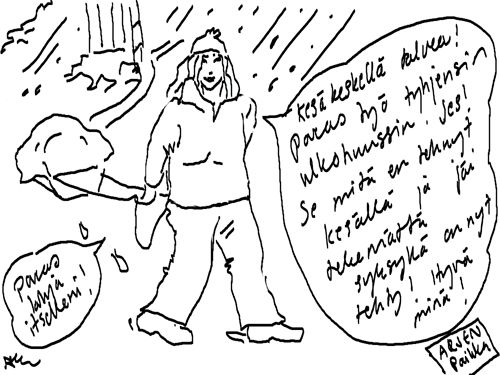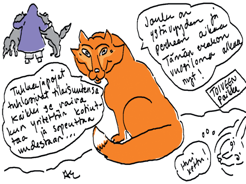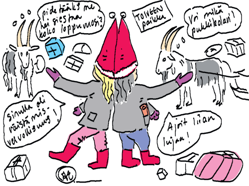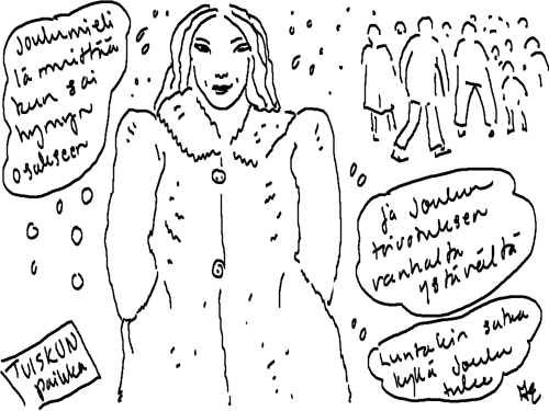 Voi ystävät! Pitkin päivää olen piirtänyt kuvan kerrallaan Joulun paikka tarinaa ja nauranut kertomuksen käänteille! Tähän väliin voin kertoa että ulkona sataa vettä ja meidän huvilan rinne on aivan paljas jäätikkö jonka päällä on vielä kaiken lisäksi vettä! Totesin hetki sitten Paimenpoika koirani kanssa että ulkohuussiinkin meneminen on pimeässä itsetuhoinen yritys. Tällä hetkellä istun tallin heinäladossa, pikku tauko, vielä Pitäis kiskoa kolme ahkiollista puruja talliin. Yhteen ahkioon menee kolme kottikärryllistä ja yhdeksään karsinaan jokaiseen yksi ahkiollinen. Tuuli ulisee nurkissa. Pakko jatkaa hommia että pääsen värittämään joulutarinaa...